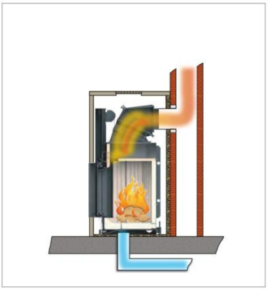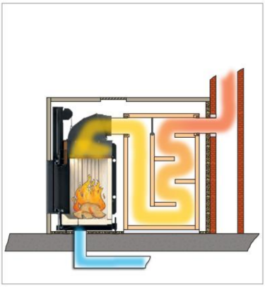 Die Heizgase werden im Heizkamin in Warmluft umgewandelt. Das Ergebnis sind hohe Warmluftleistungen auf kleiner Grundfläche.