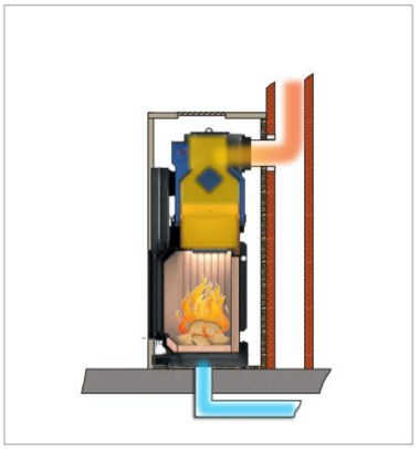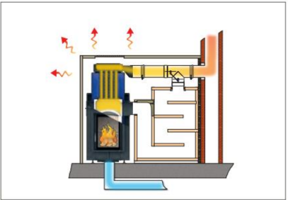 Ein Kesselkörper wird auf den Kamin aufgesetzt. Das damit erwärmte Wasser unterstützt ihre Zentralheizung und somit wird die Abwärme des Heizkamins effizient genutzt. Dieses System ist die ideale Lösung im Neubau.